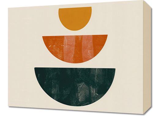 Obraz z serii boho zatytułowany Cykl Natury. Obraz przedstawia trzy przecinające się półkola, ułożone w pionowym szeregu, z których każde posiada unikalną fakturę i paletę barw - od spokojnego, złotego odcienia u góry, przez głęboką pomarańcz z akcentami ciepłej czerwieni pośrodku, do ciemnej, tajemniczej zieleni u dołu. Ta kompozycja wywołuje wrażenie harmonijnego przepływu czasu lub cykli natury. Świetnie sprawdzi się jako dekoracja w nowoczesnych przestrzeniach, takich jak minimalistyczne biura, salony w stylu skandynawskim, a także jako wyrafinowany akcent w strefach wypoczynkowych kawiarni lub butikowych hoteli.