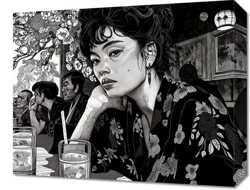 Obraz z serii motywy wschodnie zatytułowany Czarne Kimono. Przedstawia on czarno-białą scenę w restauracji, w której centralną postacią jest młoda kobieta o intensywnym spojrzeniu, ubrana w tradycyjny, kwiecisty kimono. Jej postać wyróżnia się na tle pozostałych gości, a szczegółowa grafika podkreśla wyraźne detale jej stroju i delikatnych rysów twarzy. Tło, zdobione motywem kwiatowym, nadaje głębi i kontekstu kulturowego, a całość kompozycji wywołuje atmosferę introspekcji i spokoju. Ten obraz idealnie nadaje się do wnętrz, które chcą oddać hołd klasycznej estetyce Dalekiego Wschodu lub po prostu wprowadzić element zastanowienia i piękna. Doskonale wpasuje się w przestrzenie takie jak salon, gabinet, a nawet miejsca publiczne, które pragną zapewnić swoim gościom wizualny odpoczynek i chwilę zadumy.