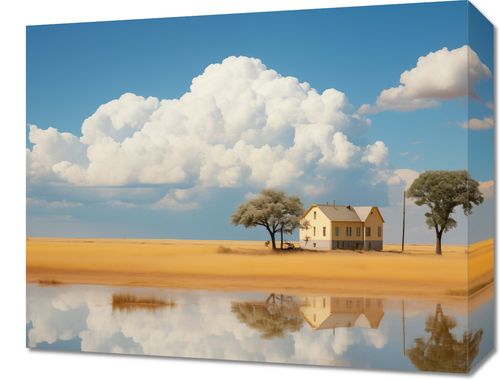 Obraz z serii pejzaże zatytułowany Domostwo, przedstawia idylliczny krajobraz z domem wiejskim, który odzwierciedla siatkę spokoju i prostoty. W centrum sceny znajduje się tradycyjny dom z jasnożółtymi ścianami i dachem w kolorze jasnoszarym, otoczony przez dwa okazałe drzewa oferujące cień i komfort. Płaski, rozległy krajobraz pokryty jest suchą, złotą trawą, która kontrastuje z błękitnym, rozległym niebem usianym puszystymi białymi chmurami. Poniżej, spokojna, błyszcząca tafla wody odbija dom i drzewa, tworząc doskonałe lustrzane odbicie, które dodaje głębi i symetrii kompozycji. Ten obraz przypomina o prostych przyjemnościach życia na wsi, gdzie czas wydaje się płynąć wolniej, a natura jest blisko. Idealnie wpasuje się w przestrzenie, które mają na celu wywołać poczucie spokoju i refleksji, takie jak domowe pokoje wypoczynkowe, gabinety psychoterapeutyczne lub pomieszczenia do medytacji.