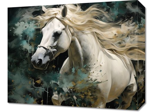 Obraz z serii natura zatytułowany Dziki Duch – dynamiczna i wyrazista kompozycja przedstawiająca arystokratycznego białego konia w pełnym galopie. Kontrast między elegancją czystej bieli sierści konia a dzikim, abstrakcyjnym tłem w odcieniach głębokiego błękitu i czerni podkreśla siłę i energię tego majestatycznego zwierzęcia. Włosy grzywy i ogona konia są przedstawione z niezwykłą szczegółowością, co daje efekt ruchu i życia. Drobne akcenty kolorystyczne w tle dodają dziełu głębi i tekstury, sprawiając, że obraz wydaje się prawie trójwymiarowy. Ten obraz to idealny wybór dla miłośników koni i natury, doskonale wkomponuje się w przestrzenie, które cenią sobie siłę, wolność i piękno natury.