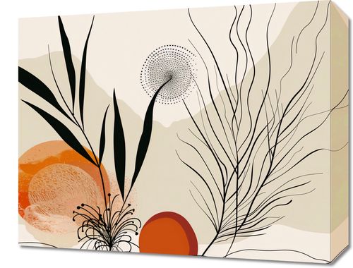 Obraz z serii minimalistyczne zatytułowany Echem przez Pustynie. Obraz przedstawia abstrakcyjny, pustynny pejzaż, gdzie organiczne kształty roślin łączą się z geometrycznymi formami słonecznych dysków. Ciemne, dynamiczne linie roślin przecinają pastelowe tło w kolorach beżu i brązu, tworząc kontrastowe ale harmonijne połączenie. Rozproszone kropki na jednym z elementów wyglądają jak drobinki piasku unoszące się w powietrzu lub delikatne nasiona rośliny gotowe do rozsiania przez wiatr. Ten obraz emanuje ciepłem i naturalnością, doskonale wpisując się w przestrzenie, które cenią sobie spokój, minimalizm i bliskość z naturą. Idealnie sprawdzi się w salonach, poczekalniach, czy jasnych korytarzach, dodając im subtelnej elegancji i organicznego charakteru.