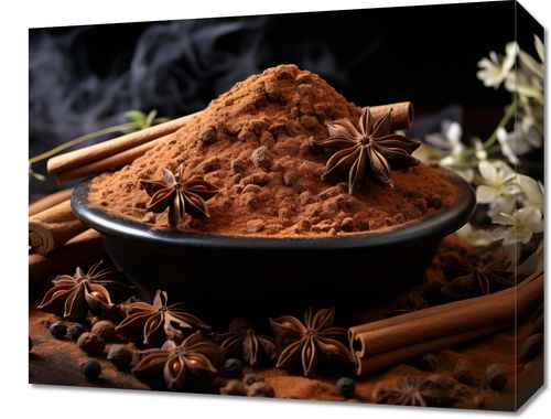 Obraz z serii święta zatytułowany Esencja Aromatu. Mocny akcent na kompozycję przypraw z cynamonem, anyżem i ziarnami pieprzu rozsypanych wokół miski pełnej mielonego cynamonu, tworzący wzór przypominający sztukę natury, wyróżnia się zarówno prostotą, jak i głębią. Delikatny dym unoszący się nad przyprawami dodaje atmosfery ciepła i domowego ogniska. Ten obraz idealnie komponuje się z kuchniami o bogatym, ziemskim wystroju, jak również z eleganckimi restauracjami oferującymi etniczną kuchnię, gdzie podkreśli uczucie przytulności i tradycji.