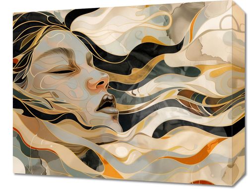 Obraz z serii abstrakcja zatytułowany Głębia. Prezentuje abstrakcyjne, stylizowane przedstawienie twarzy kobiety, zatopionej w płynnych, onirycznych formach przypominających fale lub wstęgi tkaniny. Szeroka gama barw, od głębokich czerni, przez delikatne beże, aż po złote i pomarańczowe akcenty, tworzy bogatą paletę kolorystyczną. Kontury twarzy są wyraźne i zmysłowe, z zamkniętymi oczami i lekko rozchylonymi ustami, co może sugerować stan zadumy lub ekstazy. Artystyczne linie tworzą złudzenie ruchu i płynności, a cała kompozycja jest zarówno dynamiczna, jak i harmonijna. Obraz ten może być interpretowany jako metafora piękna ludzkiego ducha, muzyki, sztuki lub emocji. Idealnie nadawałby się do eleganckich, nowoczesnych wnętrz, gdzie może stanowić główny punkt wizualny, przyciągając uwagę i inspirując do refleksji.