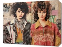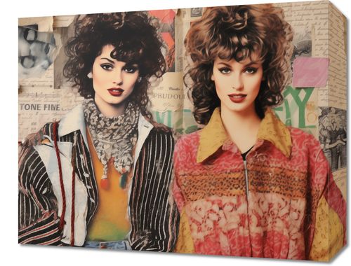 Obraz z serii pop art zatytułowany Ikony Stylu'80. Na tym nostalgicznie inspirowanym dziele sztuki widzimy dwie kobiety ubrane w odzież z lat 80., z charakterystycznymi, bujnymi fryzurami i wyrazistym makijażem. Ich postacie zostały umieszczone na tle kolażu z epoki, wypełnionego fragmentami starych gazet, ręcznych pism i ilustracji, co dodaje kontekstu historycznego i kulturowego. Silne kontrasty kolorystyczne i wyraźne linie twarzy podkreślają wyrazisty charakter obu postaci. Ten obraz to hołd dla mody i kultury lat 80., idealny dla przestrzeni, które pragną dodać retroflairu i odzwierciedlić ducha minionych dekad.