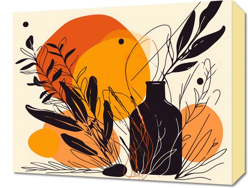 Obraz z serii minimalistyczne zatytułowany Jaskrawy Zachód. Na grafice widnieje silnie stylizowany motyw roślinny, gdzie czarne sylwetki roślin kontrastują z jaskrawo pomarańczowym i żółtym tłem, przypominającym zachodzące słońce. W tle pojawiają się delikatne, abstrakcyjne linie i kształty, dodające kompozycji głębi i tekstury.Ten plakat doskonale wpasuje się w wnętrza ożywione roślinnością, zarówno te domowe, jak i komercyjne przestrzenie typu kawiarnie lub sklepy z roślinami. Jego ciepłe barwy będą wprowadzać przytulną atmosferę i mogą stanowić żywy akcent w przestrzeniach utrzymanych w naturalnej kolorystyce.