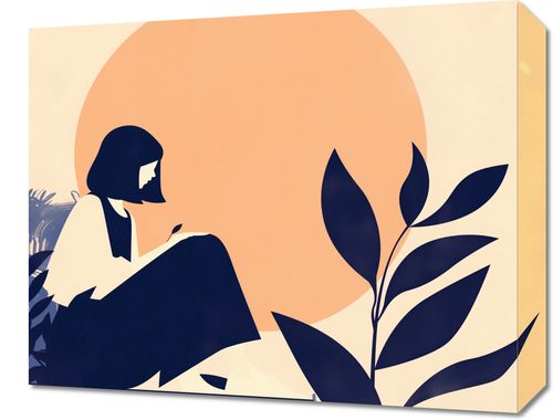 Obraz z serii minimalistyczne zatytułowany Kontemplacja. Ta delikatna grafika przedstawia sylwetkę kobiety w stanie kontemplacji na tle dużego, ciepłego, pomarańczowego słońca. Sylwetka jest otoczona przez proste, ale eleganckie czarne rośliny, co dodaje kompozycji spokojnego nastroju.Ten obraz jest idealny dla przestrzeni, które pragną wprowadzić momenty spokoju i refleksji. Będzie wspaniałym dodatkiem do sypialni, czytelni, kącików medytacyjnych czy nawet przestrzeni terapeutycznych.