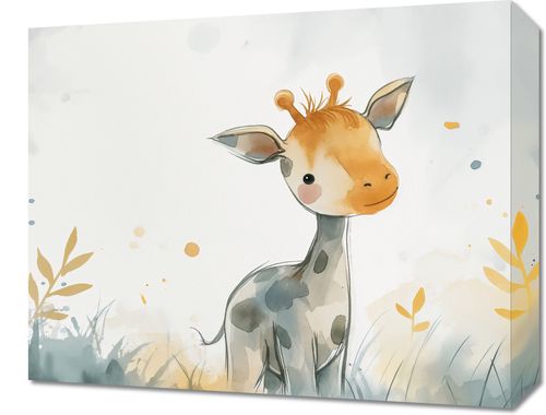 Obraz z serii wnętrza zatytułowany Mała Żyrafka. Uroczy obraz przedstawia młodą żyrafę o łagodnym spojrzeniu, wyłaniającą się z akwarelowej mgły pastelowych barw. Delikatne krople farby i subtelne linie tworzą atmosferę czystości i spokoju, nadając dziełu ciepły i relaksujący nastrój. Ten obraz, emanujący dziecięcą niewinnością i ciekawością świata, będzie idealnym dodatkiem do przestrzeni dziecięcej, takiej jak pokoje maluchów, przedszkola lub miejsca oczekiwania w placówkach pediatrycznych, zachęcając małych i dużych do marzeń i odkrywania piękna przyrody.