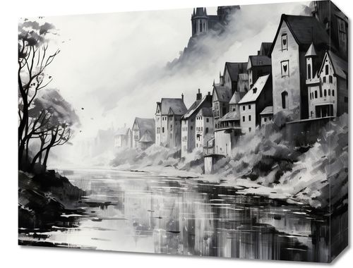 Obraz z serii pejzaże zatytułowany Mglisty Refleks. Misterne pociągnięcia pędzla przedstawiają starą wieś schowaną w mrocznych zakątkach gór, z dominującymi wieżami kościoła wznoszącymi się nad nią. Mgła otulająca krajobraz i odbicie w spokojnej wodzie tworzą atmosferę tajemniczości i zadumy. Monochromatyczna paleta barw dodaje głębi i intensywności całemu obrazowi, czyniąc go idealnym wyborem dla klasycznych salonów oraz miejsc takich jak kawiarnie o historycznym charakterze czy ekskluzywne kluby dyskusyjne.