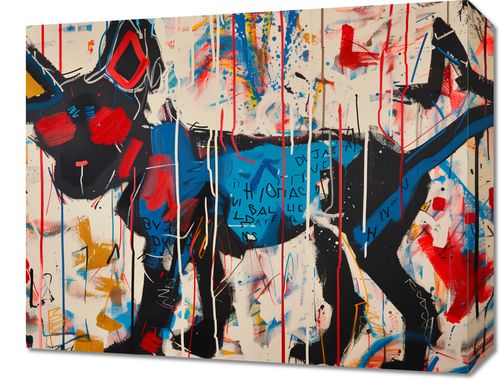 Obraz z serii abstrakcja zatytułowany Miejski Pies. Żywa kompozycja przedstawia sylwetkę psa w stylu street art w której dominują kolory takie jak czerwień, niebieski i żółty, które są rozmieszczone na płótnie w sposób dynamiczny i spontaniczny. Praca wydaje się być pełna ruchu dzięki pociągnięciom pędzlem i kroplom farby rozpryskującym się w różnych kierunkach. Na pierwszy plan wyłania się czarna sylwetka psa, której kontury są podkreślone kontrastującymi barwami i szkicowym stylem. W tle można dostrzec chaotyczne linie i formy, które mogą symbolizować miejski chaos i energię, a także fragmenty tekstu, które dodają dziełu charakteru ulicznego muralu. Całość sprawia wrażenie radosnej i pełnej energii ekspresji artystycznej. Świetnie sprawdzi się w nowoczesnych przestrzeniach miejskich.