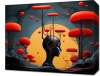 Obraz z serii pop art zatytułowany Myślokształty. Ten obraz przedstawia profil człowieka z głową pełną drzew, które wydają się być przedłużeniem jego myśli i świadomości, symbolizując połączenie umysłu z naturą. Drzewa mają formę fantastycznych, czerwonych kształtów przypominających grzyby, a ich rozgałęzienia łączą się z otaczającą atmosferą, z której unoszą się podobne formacje. Kontrastujące kolory, z dominującym czerwieniem i spokojnym tłem, tworzą wizualny dialog między rzeczywistością a wyobraźnią. Obraz zaprasza do refleksji nad bogactwem wewnętrznego świata i jego wpływem na percepcję zewnętrznej rzeczywistości, będąc wyjątkowym dodatkiem do każdego środowiska poszukującego głębi i inspiracji.