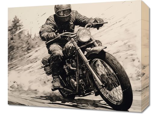 Obraz z serii abstrakcja zatytułowany Na Pełnej Prędkości. Ta monochromatyczna ilustracja uchwyciła motocyklistę w pełnym ruchu, przemierzającego drogę z wysoką prędkością. Dynamiczne pociągnięcia pędzla i grę światłocienia nadają obrazowi poczucie szybkości i ruchu, podkreślając siłę i energię zarówno jeźdźca, jak i maszyny. W tle zamazane linie sugerują przemykający krajobraz, co wzmacnia wrażenie prędkości. Obraz ten jest idealny dla miłośników motocykli, jako dekoracja w garażach, warsztatach lub jako wyrazisty element wystroju w przestrzeniach mieszkalnych, inspirując do poczucia wolności i przygody.