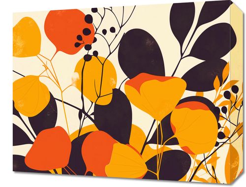 Obraz z serii minimalistyczne zatytułowany Ogrodowa Paleta. Na tej grafice dominują roślinne motywy z wyraźnymi konturami na tle pastelowych barw. Intensywne odcienie czerwieni, pomarańczy i żółci przeplatają się z głębokimi czerniami i złocistymi akcentami, tworząc bogaty, lecz harmonijny obraz.Ten obraz znajdzie swoje miejsce w przestrzeniach, gdzie kolor i życie są celebrowane. Z powodzeniem ozdobi ściany kreatywnych biur, eklektycznych salonów czy przytulnych zakątków domu. Jego energetyzujące barwy wniosą ciepło i radość do każdego wnętrza, jednocześnie będąc odważnym akcentem w bardziej stonowanych dekoracjach.