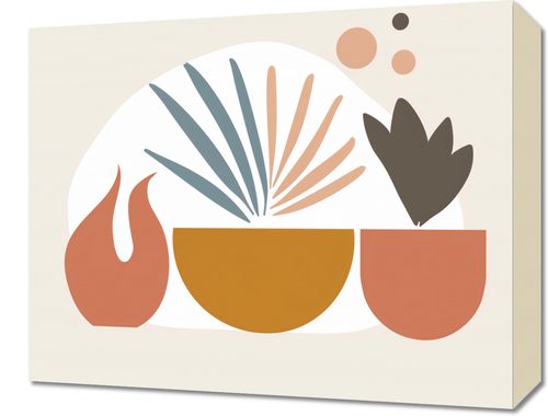 Obraz z serii boho zatytułowany Paleta Roślinna.Ten obraz łączy geometryczną prostotę z motywami roślinnymi, tworząc czystą i nowoczesną interpretację natury. Stonowana kolorystyka z akcentami pastelowych barw wprawia w stan relaksu i spokoju. Motywy roślinne, stylizowane na abstrakcyjne kształty, wyłaniają się z prostokątnych doniczek, tworząc harmonijną całość. Jest to idealny wybór dla tych, którzy cenią sobie spokój i przytulność w swoim domowym zaciszu. Obraz będzie pasował do przestrzeni życiowej urządzonej w duchu skandynawskim lub minimalistycznym, gdzie prostota formy idzie w parze z naturalnym pięknem. Może ozdobić ściany w salonach, sypialniach lub biurach, gdzie wprowadzi odrobinę naturalnej estetyki bez przytłaczania przestrzeni.
