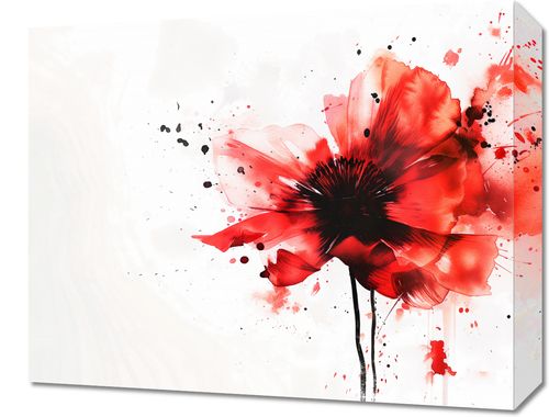 Obraz z serii abstrakcja zatytułowany Płynna Akwarela. Na obrazie przedstawiony jest kwiat w stylu akwarelowym, z dominującą czerwoną paletą barw, która przechodzi w mocne akcenty czerni w centrum kwiatu. Obraz ma dynamiczny i spontaniczny charakter, co podkreślają rozbryzgi i krople farby rozchodzące się wokół kwiatu. Przypomina to efekt plamy, który dodaje kompozycji artystycznego wyrazu i energii. Kontrast między delikatnymi czerwieniami a głęboką czerń centrum kwiatu przyciąga wzrok i czyni obraz bardzo wyrazistym. Tło jest jasne z subtelnie zaznaczonymi plamami, co dodatkowo akcentuje dramatyzm i piękno przedstawionego kwiatu.