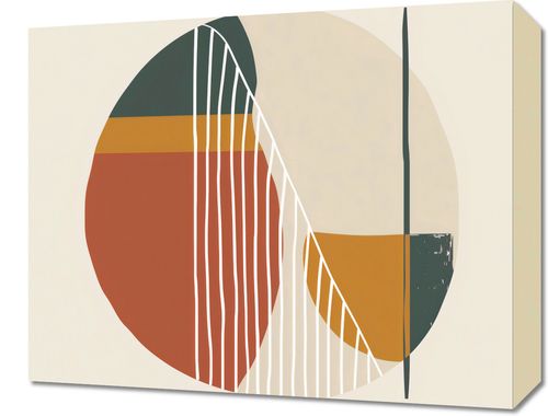 Obraz z serii boho zatytułowany Półbłysk. Obraz przedstawia abstrakcyjne, geometryczne formy w ciepłej, ziemistej palecie barw. W centrum kompozycji widnieje duży, półprzezroczysty krąg, w którym mieszają się bloki kolorów: od głębokiej zieleni, poprzez terakotę, po musztardowy i kremowy. Przez środek tego kręgu biegną pionowe, białe linie, które dodają kompozycji głębi i rytmu, tworząc efekt przestrzenności. Z prawej strony obrazu, cienka, czarna linia tworzy swego rodzaju kontrapunkt dla zaokrąglonych form. Ten obraz idealnie odnajdzie się w nowoczesnych przestrzeniach, gdzie dominują proste formy i stonowane barwy. Jego spokojna paleta kolorów i czyste linie będą doskonałym tłem dla minimalistycznych biur, eleganckich salonów czy designerskich poczekalni. Dzieło to może również służyć jako subtelny akcent w przestrzeniach, gdzie dominują naturalne materiały i stonowana kolorystyka.