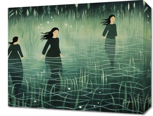 Obraz z serii wnętrza zatytułowany Pośród Ciszy, przedstawia grupę postaci kobiecych, poruszających się z gracją przez mglisty, oniryczny krajobraz. Zanurzone po kolana w wodzie, otoczone przez zielone, eteryczne trawy i dyskretnie świecące światła, postacie emanują spokojem i tajemniczością. Styl obrazu, z jego płynnymi liniami i spokojnymi odcieniami zieleni, tworzy uczucie medytacyjnej głębi i harmonii z naturą. Ten obraz idealnie nadaje się do wnętrz, które pragną odzwierciedlić głęboką spokojność i introspekcję, takich jak pokoje medytacyjne, strefy relaksu, domowe biblioteki, a także jako subtelny akcent w przestrzeniach publicznych, gdzie zachęca do chwili wytchnienia i refleksji.