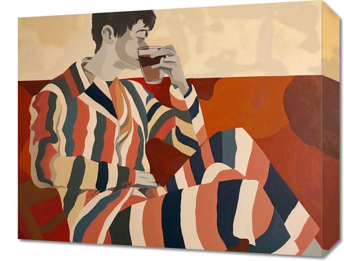 Obraz z serii abstrakcja zatytułowany Przerwa Aby Odetchnąć. Prezentuje postać mężczyzny w paskowanym szlafroku, zatopionego w degustacji filiżanki herbaty. Stylizacja grafiki nawiązuje do modernistycznej estetyki z użyciem geometrycznych kształtów i ograniczonej palety barw, co nadaje scenie spokojny i zrelaksowany nastrój. Ciepłe odcienie czerwieni i brązów w tle kompozycji podkreślają atmosferę intymności i domowego ciepła. Ten obraz idealnie wpasuje się w przestrzenie takie jak salon, biblioteka, czy przytulne zakątki do czytania i odpoczynku. Może także stanowić inspirujący akcent w kawiarniach lub herbaciarniach, gdzie zachęca do chwili oddechu i cieszenia się chwilą.