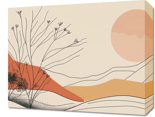 Obraz z serii boho zatytułowany Pustynna Wydma. Obraz ukazuje krajobraz z delikatnie zarysowanymi roślinami na tle łagodnych, pustynnych wydm. Spokojna kolorystyka, opierająca się na miękkich odcieniach beżu, pomarańczy i czerwieni, oddaje kojący klimat zmierzchu. W tle widoczne jest wielkie, ciepłe słońce, które rzuca złoty blask na całą scenę, nadając jej harmonijny charakter. Ten obraz będzie piękną dekoracją do wnętrz, które pragną wprowadzić elementy natury w połączeniu z minimalistycznym designem. Jego uspokajające barwy i proste linie idealnie wpasują się w przestrzenie takie jak sypialnie, salony, miejsca odpoczynku, czy nawet biura kreatywne, pragnące wykreować przestrzeń sprzyjającą relaksowi i inspiracji.
