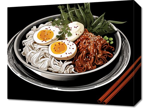 Obraz z serii wnętrza zatytułowany Ramen w Sztuce. Ta apetyczna ilustracja przedstawia klasyczną miskę ramenu, w której harmonijnie komponują się ułożone białe nudle, soczyste półmiski jajka, pikantne kiełki i świeże zielone warzywa, wszystko oprawione w wyraziste akcenty sosu i przypraw. Intensywne kolory i precyzyjne detale rysunku, od czerwonych pałeczek po lśniące składniki, celebrują estetykę i smak tradycyjnego japońskiego dania. Plakat ten wniesie do każdej przestrzeni, od kuchni po jadalnie, ducha nowoczesnego designu i miłości do kulinarnych przyjemności.