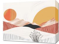 Obraz z serii boho zatytułowany Roztańczone Słońce. Obraz przedstawia abstrakcyjny pejzaż, w którym harmonia form i kolorów tworzy obraz pełen spokoju i równowagi. Jego głównymi elementami są stylizowane wzgórza, które płynnie przechodzą w miękkie linie, oraz dwa słońca, które swymi barwami ożywiają całą kompozycję. Delikatna roślinność w przedniej części dodaje głębi i tekstury, a zabawa cieniem i światłem wydobywa z obrazu uczucie ciepła.Ten obraz będzie doskonałym dodatkiem do wnętrz, gdzie pragnie się stworzyć atmosferę spokoju i odpoczynku, takich jak salony, gabinety lub pokoje gościnne. Jego subtelne barwy i proste formy wprowadzą do każdej przestrzeni odrobinę natury i ciepła.