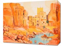 Obraz z serii abstrakcja zatytułowany Ruiny pod Słońcem. Ta ilustracja przedstawia scenę z antycznymi ruinami w ciepłej, pastelowej palecie kolorów, która oddaje odczucie spiekoty i światła słonecznego. Zarysy starożytnej architektury wyrastają z pustynnego krajobrazu, nadając scenerii poczucie wieczności i historii. Odbicie wody i subtelne sylwetki postaci w tle wprowadzają ludzki wymiar do tej scenerii, sugerując trwającą obecność i ciągłość cywilizacji. Obraz ten idealnie wprowadzi do każdego wnętrza element przygody i odkryć, inspirowany podróżami i historią, idealny dla przestrzeni publicznych, biur podróży, a także jako dekoracja w domach miłośników historii.