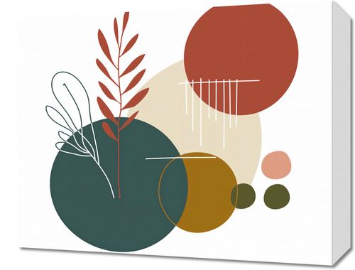 Obraz z serii minimalistyczne zatytułowany Rytm Warkotu. Ta grafika przedstawia stylizowane rośliny w ciepłych odcieniach czerwieni i zieleni, kontrastujące z geometrycznymi kształtami kół w spokojnych barwach beżu, żółci i głębokiej zieleni. Linie pionowe, wydające się być jak deszcz, dodają dynamiki i lekkości kompozycji.Ten obraz będzie się pięknie prezentować w przestrzeniach, które celebrują spokój i naturę. Doskonale wpasuje się w estetykę zen, ekologicznych wnętrz, czy w każdym pomieszczeniu, które ma na celu wprowadzenie elementów natury do domowego otoczenia. Będzie to świetny wybór dla tych, którzy szukają dekoracji ściennych do jasnych, przestronnych pomieszczeń, takich jak salony, jadalnie czy przestrzenie do medytacji.