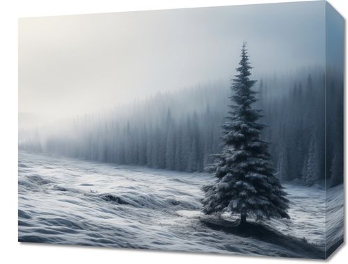 Obraz z serii pejzaże zatytułowany Samotna Choinka. Ta grafika ukazuje malowniczy, zimowy krajobraz z dominującą pojedynczą, okazałą choinką pokrytą śniegiem. Otoczona przez delikatnie zasnutej mgłą lasy, podkreśla spokój i majestatyczną ciszę zimy. Delikatne odcienie błękitu i bieli tworzą wrażenie chłodu i spokoju. Ten obraz będzie idealnym dodatkiem do każdego wnętrza, gdzie chcemy wprowadzić atmosferę spokoju i kontemplacji, świetnie sprawdzi się w przestrzeniach takich jak gabinety relaksacyjne, spa, a także jako element dekoracyjny w domowych salonach lub sypialniach.