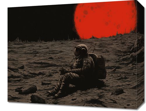 Obraz z serii abstrakcja zatytułowany Samotność w Kosmosie przedstawia astronautę siedzącego na pustkowiu księżycowym, z ogromną czerwoną gwiazdą w tle. Osamotniony kosmonauta wygląda na zamyślonego lub odpoczywającego, otoczony przez surowy, nierówny krajobraz księżycowy, z jego charakterystycznymi kraterami i szczytami. Obraz emanuje głębokim spokojem i izolacją, podkreślając zarówno piękno, jak i nieprzewidywalność przestrzeni kosmicznej. Wyrazisty kontrast między ciemnymi skałami a jaskrawą gwiazdą podkreśla dramatyczną aurę tej sceny. Ten obraz idealnie nadawałby się do dekoracji ścian w domowych biurach lub przestrzeniach edukacyjnych, inspirowanych tematyką kosmiczną.