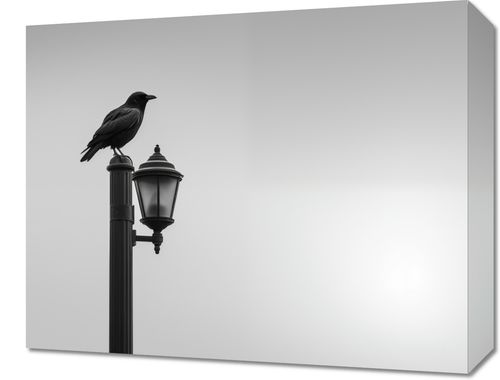 Obraz z serii wnętrza zatytułowany Samotny Postój Kruka. Prezentuje on sylwetkę kruka spoczywającego na klasycznej latarni ulicznej, uchwyconą w monochromatycznej palecie szarości. Ten spokojny, lecz sugestywny obraz jest symbolem refleksji i tajemnicy, doskonale wpisując się w klimat współczesnych przestrzeni miejskich. Praca ta z pewnością stanie się wyrazistym dodatkiem do nowoczesnych wnętrz, takich jak lofty czy minimalistyczne salony, a także wniesie element zastanowienia do przestrzeni publicznych takich jak galerie, kawiarnie i biblioteki, gdzie odosobnienie miesza się z miejskim zgiełkiem.