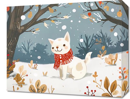 Obraz z serii wnętrza zatytułowany Śnieżny Kompan. Urocze przedstawienie białego, puchatego psa w czerwonym szaliku, który przywołuje ciepłe uczucia w chłodnym, zimowym otoczeniu. Zwierzę z radosnym wyrazem twarzy wydaje się cieszyć spadającymi płatkami śniegu, co dodaje obrazowi poczucia radości i bezpretensjonalnej zabawy. Tło w pastelowych odcieniach bieli i szarości z delikatnymi akcentami kolorystycznymi tworzy spokojną i relaksującą atmosferę. Obraz idealnie nadaje się do dekoracji pomieszczeń dziecięcych, salonów, czy przytulnych kawiarni, wprowadzając do wnętrza element zabawy i niewinności. Jego ciepłe barwy i sympatyczny motyw sprawią, że będzie doskonałym dodatkiem do miejsc, w których chcemy poczuć odrobinę zimowego ciepła i uroku.