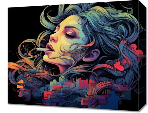 Obraz z serii pop art zatytułowany Sny o Samej Sobie. Ta intensywnie kolorowa ilustracja przedstawia profil młodej kobiety z zamkniętymi oczami, wdychającej życie miasta. Jej włosy i wydychany dym przenikają się, tworząc hipnotyzujące wzory, które płynnie przechodzą w sylwetki miejskiej panoramy. Paleta barw łączy głębokie granaty, żywe pomarańcze i delikatne pastele, co nadaje dziełu zarówno dynamikę, jak i eteryczną jakość. Obraz idealnie oddaje związek między osobistymi doświadczeniami a pulsującym życiem metropolii, co sprawia, że będzie on wyjątkowym dodatkiem do nowoczesnych, miejskich wnętrz, studiów artystycznych, czy loftów.