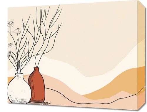 Obraz z serii minimalistyczne zatytułowany Stylowe Beże. Obraz przedstawia uproszczoną, elegancką kompozycję waz z suszonymi roślinami na tle delikatnych, pustynnych wzgórz. Wazony o prostych formach i kontrastowych kolorach - jeden biały, drugi w odcieniu ciepłej cegły - stoją przed zmiennym tłem beżów i brązów. Rośliny zostały przedstawione za pomocą czarnych, finezyjnych linii, które dają iluzję delikatności i subtelności. Obraz z łatwością wpasuje się w różne wnętrza dzięki swojej neutralnej palecie kolorów i prostocie form. Będzie doskonałym wyborem do pomieszczeń urządzonych w stylu skandynawskim, boho, a także w nowoczesnych przestrzeniach biurowych. Zapewnia ciepło i wyrafinowanie, a jednocześnie nie przytłacza przestrzeni.