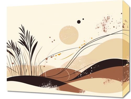 Obraz z serii minimalistycznej zatytułowany Szept Gwizdu. Widać na nim stylizowaną kompozycję z trawami i kształtami, które mogą przywoływać na myśl górskie krajobrazy. Barwy są ciepłe i naturalne, z dominującymi beżami, brązami oraz akcentami w kolorze terakoty.Ten plakat doskonale uzupełni wnętrza w stylu boho, skandynawskim, jak również te o bardziej rustykalnym czy naturalnym charakterze. Jego spokojna paleta kolorów i subtelna grafika sprawią, że będzie idealnym dodatkiem do sypialni lub salonu, wprowadzając atmosferę relaksu i spokoju.