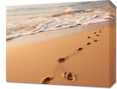 Obraz z serii pejzaże zatytułowany Szepty Fal przedstawia obraz, który zaprasza widza do kontemplacji i refleksji. Delikatne ślady stóp wskazują na cichą obecność, a przytłumione szumy fal i miękki piasek podkreślają uczucie spokoju. Rozmyte kolory zachodu słońca, które malują niebo na niemal nierzeczywiste odcienie pomarańczy i błękitu, wydają się być synonimem spokojnego zakończenia dnia. Ta praca idealnie wkomponuje się w estetykę współczesnych salonów lub pokoi wypoczynkowych, które cenią sobie minimalizm i naturę, a także będzie znakomitym wyborem dla przestrzeni wellness i spa, gdzie harmonia i spokój są kluczowymi elementami.