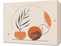 Obraz z serii boho zatytułowany Tonacja Pasteli. Obraz przedstawia harmonijną kompozycję elementów natury i abstrakcyjnych kształtów. Widzimy doniczkę z delikatną rośliną o czarnych, smukłych liściach, które delikatnie kontrastują z ciepłym odcieniem pomarańczy naczynia. Towarzyszą jej geometryczne formy: dwa krągłe kształty w tonacji ziemi, które przeplatają się, tworząc iluzję przestrzeni i głębi. Rysunek uzupełnia subtelna linia horyzontu i rozproszone kropki, dodające plakatowi dynamiki. Idealnie sprawdzi się jako element dekoracyjny w pomieszczeniach, gdzie dominuje spokój i równowaga, takich jak jasne, przestronne salony, pokoje do medytacji lub ciche zakątki bibliotek.