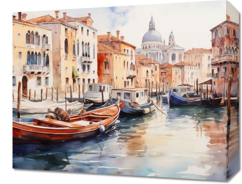 Obraz z serii pejzaże zatytułowany Wenecka Impresja, przedstawia malowniczą scenę kanałów Wenecji. Styl przypominający akwarelę, z miękkimi pociągnięciami i pastelowymi refleksami na wodzie, uchwycił zarówno spokój, jak i żywą atmosferę tego zabytkowego miasta. Łodzie i gondole są cicho przywiązane do nabrzeża, a w tle wznosi się charakterystyczna sylwetka bazyliki. Ten obraz przyciąga uwagę swoją grą światła i koloru, sugerując historie i tajemnice tkwiące w sercu Wenecji. Idealnie sprawdzi się jako element dekoracyjny w przestrzeniach, które pragną przywołać elegancję i historyczną głębię, takich jak salony, studia, biura, a nawet restauracje, które chcą dodać odrobinę włoskiego charakteru do swojego wnętrza.