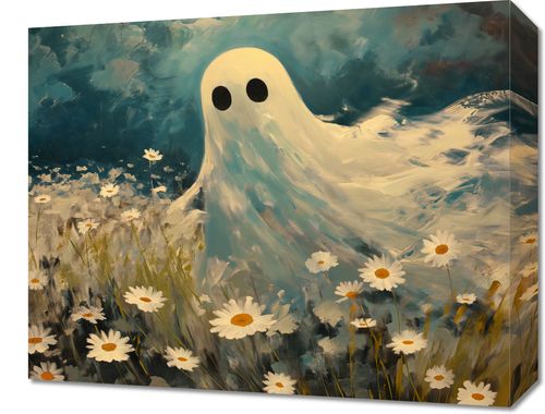 Obraz z serii abstrakcja zatytułowany Widmo Dawnej Łąki.Obraz przedstawia sympatyczną, uproszczoną postać ducha unoszącego się nad łąką pełną białych stokrotek. Duch ma duże, okrągłe oczy, co nadaje mu przyjazny wygląd. Tło to dynamicznie namalowane pociągnięcia pędzlem w odcieniach niebieskiego i brązu, co sprawia wrażenie burzowego nieba lub wschodzącej burzy. Postać ducha kontrastuje z ciemniejszym tłem, a jasne, żywe kolory kwiatów dodają kompozycji ciepła i lekkości. To połączenie elementów może symbolizować nadzieję i pokój w obliczu przeciwności, nadając plakatowi głębsze znaczenie. Idealny do dekoracji wnętrz dla osób ceniących sobie odrobinę humoru i optymizmu.