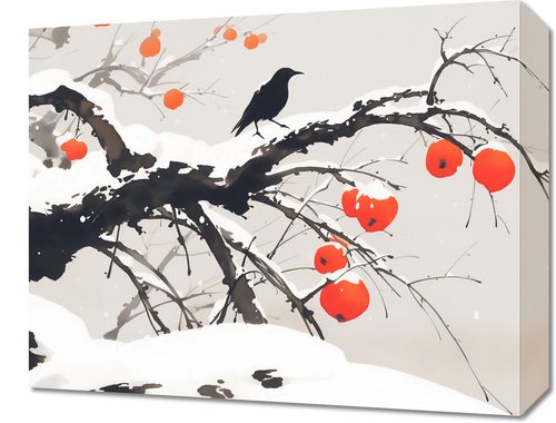 Obraz z serii motywy wschodnie zatytułowany Wschodnia Akwarela przedstawia zimowy krajobraz w stylu wschodnim. Drzewo o ciemnych, wyrazistych gałęziach pokrytych śniegiem wygina się elegancko na tle spokojnego, jednolitego tła. Na gałęziach znajdują się czerwone owoce, które mogą być symbolem persymonów lub innych zimowych owoców, kontrastujących swoim żywym kolorem z zimowym otoczeniem. Na jednej z gałęzi spoczywa czarny ptak, być może kruk, co dodaje życia i głębi kompozycji. Spadające płatki śniegu i subtelne odcienie w tle nadają scenie uczucie spokoju i ciszy. Ten obraz łączy prostotę z elegancją, mogąc stanowić wyrafinowaną dekorację w przestrzeniach szukających spokojnej, lecz wyrazistej estetyki.