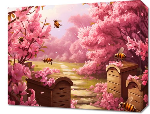 Obraz z serii natura zatytułowany Życie w Ulach – czarująca ilustracja, która celebruje obfitość i żywotność wiosny. Kompozycja przedstawia scenę z pszczółami żerującymi wśród bujnych, różowych kwiatów kwitnących drzew, co jest symbolem odradzającego się życia i płodności. Scena jest zanurzona w ciepłej, promiennej poświacie, która rozświetla drogę wiodącą przez kwiecisty krajobraz. Ule umieszczone wśród kwiatów podkreślają harmonijną współpracę między naturą a pracowitymi pszczołami. Ten obraz jest idealny do wnętrz, które pragną wprowadzić elementy natury, radości i wiosennej świeżości, doskonały do salonów, pokoi dziecinnych, a także jako inspirujący akcent w przestrzeniach edukacyjnych.