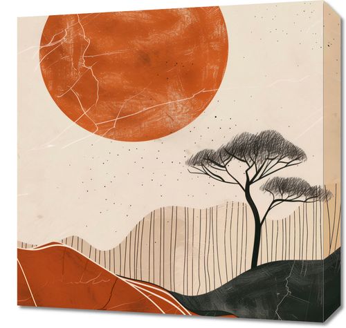 Obraz z serii boho zatytułowany Afrykański Zachód Słońca przedstawia malowniczą scenę z ciepłymi, ziemistymi barwami symbolizującymi niekończącą się pustynię. Wielkie, płonące słońce w kolorze rdzy wisi nad delikatnie zarysowanymi drzewami akacji, które są ikoniczne dla afrykańskiego krajobrazu. Linie konturów wzgórz i pustynnych wydm dodają głębi i perspektywy, a rysunkowe pęknięcia i plamy na słońcu nadają teksturę. Ta kompozycja łączy surowość pustyni z zachwycającym pięknem dzikiej przyrody, idealna dla wnętrz, które pragną odrobiny egzotyki i ciepła afrykańskich barw.