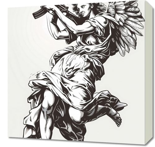 Obraz z serii pop art zatytułowany Anioł Wojny. Przedstawia on postać anioła w klasycznym stylu, jednak z nieoczekiwanym elementem współczesnym – trzyma on broń, co jest zaskakującym połączeniem tradycyjnej symboliki z nowoczesnymi motywami. Ta silna wizualna metafora może prowokować do refleksji na temat konfliktów, pokoju i dwoistości natury ludzkiej. Zastosowanie monochromatycznej kolorystyki wzmacnia dramatyzm kompozycji, a sama praca może stanowić wyrazisty akcent w nowoczesnych przestrzeniach, które cenią sobie głęboką symbolikę i odważne wyraz artystyczny.