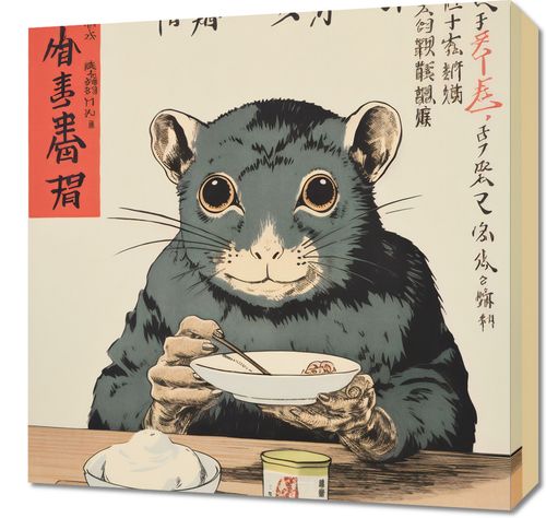 Obraz z serii motywy wschodnie zatytułowany Chwila Refleksji. Intrygujące spojrzenie gryzonia w tradycyjnym stroju, podkreślane przez błękitną tunikę i precyzyjne detale, które nadają mu humanoidalnego charakteru. Czerwone naczynia oraz kanji w tle kontrastują z jasnymi barwami obrazu, dodając nuty głębi i dziedzictwa kulturowego. Subtelna gra światła i cienia na stoliku z jedzeniem i napojem wzbogaca kompozycję i zachęca do refleksji nad połączeniem tradycji z nowoczesnością. Świetnie sprawdzi się w kawiarniach o azjatyckim klimacie, galeriach sztuki oraz w przestrzeniach dedykowanych kulturze Wschodu.