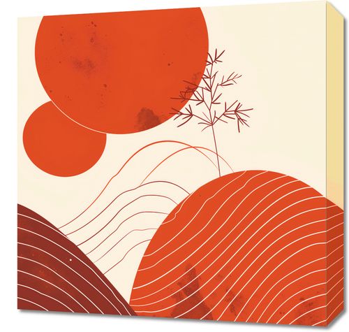 Obraz z serii minimalistyczne zatytułowany Ciepło Czerwieni. Przedstawia on abstrakcyjny krajobraz, w którym dominują okrągłe formy w odcieniach ciepłej czerwieni, nawiązujące do zachodzącego słońca. Delikatna roślina, która wyrasta nad falującymi wzgórzami, wprowadza element natury i spokoju. Warstwowe linie w kształcie fal przedstawiają kształtujący się teren, dodając głębi i ruchu kompozycji. Ten obraz przywodzi na myśl spokój i majestatyczność końca dnia, jest idealny do umieszczenia w przestrzeniach, które celebrują naturalne piękno i proste momenty, takie jak salon, gabinet czy przestrzeń do medytacji.