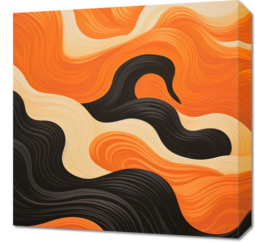 Obraz z serii abstrakcja zatytułowany Dzień spotyka Noc. Falujące wzory przypominają o zachodach słońca na horyzoncie, gdzie słońce zanika za krętą linią nocy. Wzory w odcieniach pomarańczu i złota ścierają się z głęboką czernią, tworząc harmonijną grę świateł i cieni. Te przenikające się kolory dodają obrazowi energii i dynamiki, prowadząc nas przez krajobraz zmieniającego się dnia. Kontrast pomiędzy ciepłymi i chłodnymi tonami przyciąga wzrok i wciąga w głąb kompozycji. Idealny dla nowoczesnych kawiarni, artystycznych przestrzeni oraz domowych salonów pragnących wprowadzić nutę spokoju i refleksji.