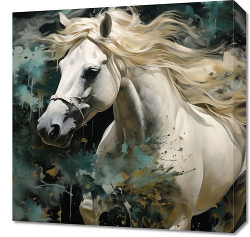 Obraz z serii natura zatytułowany Dziki Duch – dynamiczna i wyrazista kompozycja przedstawiająca arystokratycznego białego konia w pełnym galopie. Kontrast między elegancją czystej bieli sierści konia a dzikim, abstrakcyjnym tłem w odcieniach głębokiego błękitu i czerni podkreśla siłę i energię tego majestatycznego zwierzęcia. Włosy grzywy i ogona konia są przedstawione z niezwykłą szczegółowością, co daje efekt ruchu i życia. Drobne akcenty kolorystyczne w tle dodają dziełu głębi i tekstury, sprawiając, że obraz wydaje się prawie trójwymiarowy. Ten obraz to idealny wybór dla miłośników koni i natury, doskonale wkomponuje się w przestrzenie, które cenią sobie siłę, wolność i piękno natury.