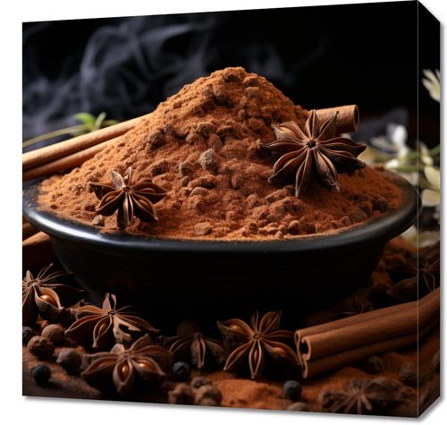 Obraz z serii święta zatytułowany Esencja Aromatu. Mocny akcent na kompozycję przypraw z cynamonem, anyżem i ziarnami pieprzu rozsypanych wokół miski pełnej mielonego cynamonu, tworzący wzór przypominający sztukę natury, wyróżnia się zarówno prostotą, jak i głębią. Delikatny dym unoszący się nad przyprawami dodaje atmosfery ciepła i domowego ogniska. Ten obraz idealnie komponuje się z kuchniami o bogatym, ziemskim wystroju, jak również z eleganckimi restauracjami oferującymi etniczną kuchnię, gdzie podkreśli uczucie przytulności i tradycji.