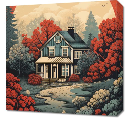 Obraz z serii wnętrza zatytułowany Idylla Rustykalna. Ten ciepły i urokliwy obraz przedstawia sielski dom otoczony przez bujny krajobraz w odcieniach czerwieni i pomarańczy, których intensywność podkreśla zachodzące słońce w tle. Kompozycja łączy w sobie elementy klasycznego amerykańskiego krajobrazu z nostalgicznym uczuciem, które przywodzi na myśl długie, leniwe popołudnia na wsi. Ilustracja ta idealnie nadaje się do nadania charakteru i ciepła każdemu wnętrzu, doskonale pasując do przestrzeni mieszkalnych, kawiarni lub pensjonatów, które chcą zaakcentować swoje powiązania z naturą i wiejskim spokojem.