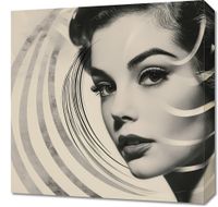 Obraz z serii pop art zatytułowany Ikonka Kina. Przedstawia czarno-białe portretowe zdjęcie klasycznej gwiazdy filmowej, której twarz jest częściowo zakryta przez geometryczny wzór spiralnych linii. Linie te dodają obrazowi dynamiki i nowoczesnego akcentu, kontrastując z retro estetyką portretu. Ten obraz łączy stare z nowym, sugerując zarówno ponadczasową piękność, jak i współczesne spojrzenie na sztukę. Idealny do eleganckich, miejskich przestrzeni lub jako dekoracja dla miłośników klasycznego kina.