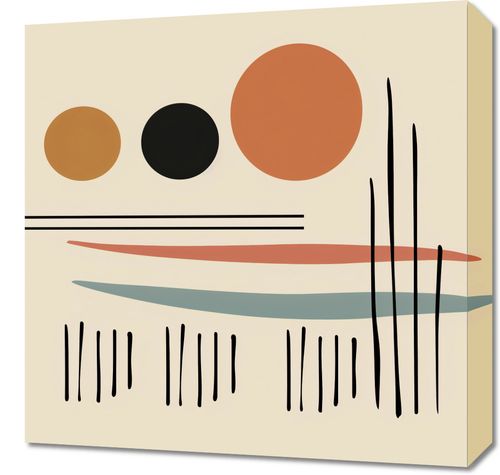 Obraz z serii boho zatytułowany Iluzja Horyzontu.Obraz to zestawienie geometrycznych kształtów i linii, które razem tworzą abstrakcyjny krajobraz. Okręgi w ciepłych odcieniach złota, pomarańcza i czerni sugerują wschodzące lub zachodzące słońce, a pionowe linie mogą przypominać wysokie trawy lub cienie drzew. Poziome pasy w różnych kolorach tworzą iluzję horyzontu, nadając kompozycji głębi i równowagi. Dzieło to wprowadzi do każdego wnętrza element spokoju i kontemplacji. Jest idealne dla przestrzeni, które cenią prostotę i abstrakcję, takich jak nowoczesne salony, minimalistyczne przestrzenie robocze, czy jako element dekoracyjny w pomieszczeniach oczekujących.