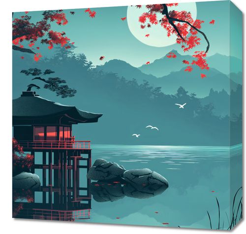 Obraz z serii motywy wschodnie zatytułowany Japoński Pawilon. Ten obraz emanuje spokojem dzięki scenie przedstawiającej tradycyjny japoński pawilon, otoczony przez wodę i delikatnie pochylające się czerwone liście klonu. Ciepłe światło wschodzącego księżyca i subtelne odbicie w wodzie podkreślają atmosferę ciszy i refleksji. Delikatne sylwetki przelatujących ptaków dodają element życia i ruchu. Obraz ten idealnie wpisuje się w przestrzenie współczesne, minimalistyczne, a także te, które celebrują naturę i spokój, takie jak pokoje do medytacji, jadalnie, czy też poczekalnie w spa.
